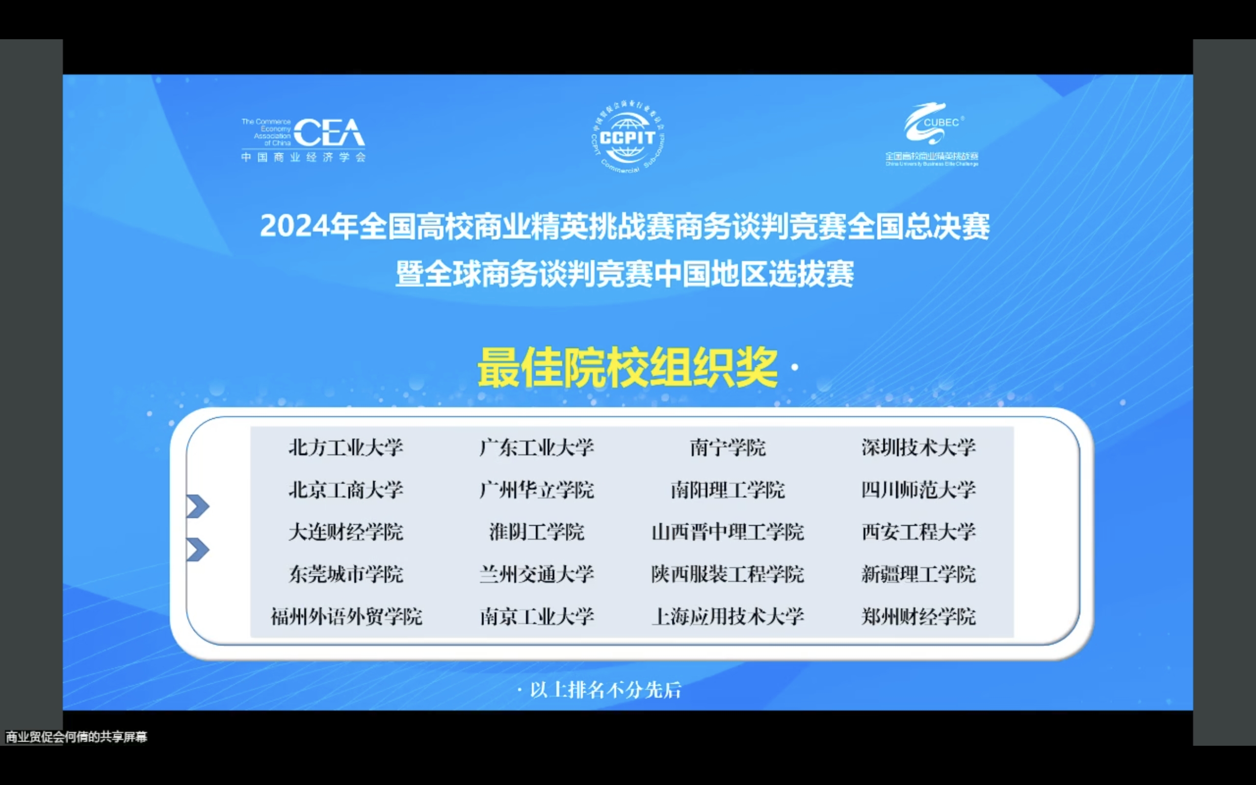 11月3日,2024年全国高校商业精英挑战赛商务谈判竞赛暨全球商务谈判竞赛中国地区选拔赛在线上圆满落幕。公司在总决赛中获得一等奖5项,二等奖2项,三等奖1项,最佳院校组织奖,其中合作共赢队和画饼大师培训小组获得本次竞赛的冠军和亚军。