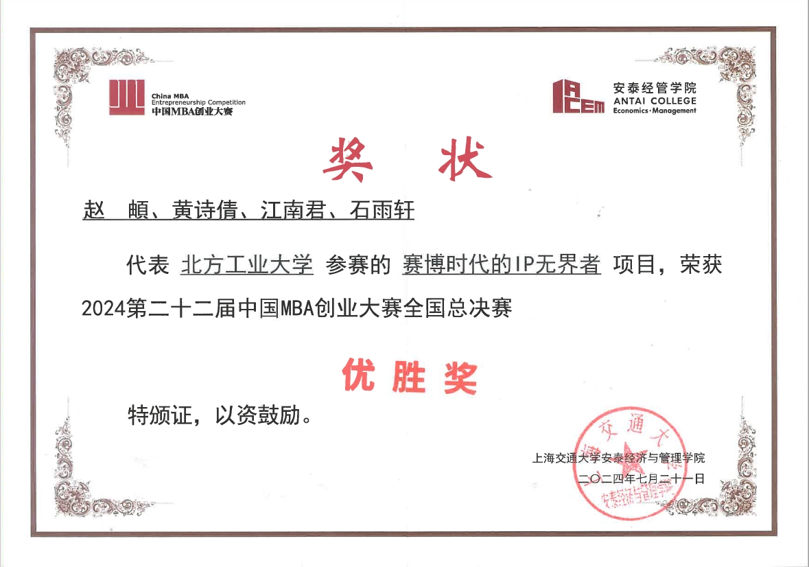 7月21日,第二十二届中国MBA创业大赛全国总决赛在上海交通大学圆满落幕。经过激烈的角逐,公司23级MBA赵頔同学负责的“赛博时代的IP无界者”项目荣获全国总决赛“优胜奖”,WilliamHill中文官方网站刘冰老师荣获“优秀创新创业导师奖”,牛天勇老师荣获“优秀组织奖”。这是williamhill官方网站MBA首次参赛,即一路披荆斩棘冲出初赛、入围复赛、挺进全国总决赛,取得优异成绩。