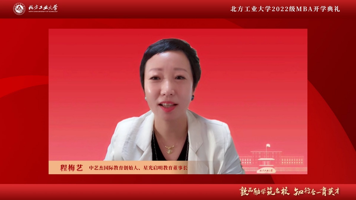 中艺杰国际教育创始人、星光启明教育董事长程梅艺代表校外导师对新加入williamhill官方网站MBA的94位新生表示衷心祝贺。她表示,十分期待与大家共学、共创、共享。作为校外导师,她将始终如一地关心和支持公司的团队建设、实务创新和人才培养,尽己所能,与公司同心共进。