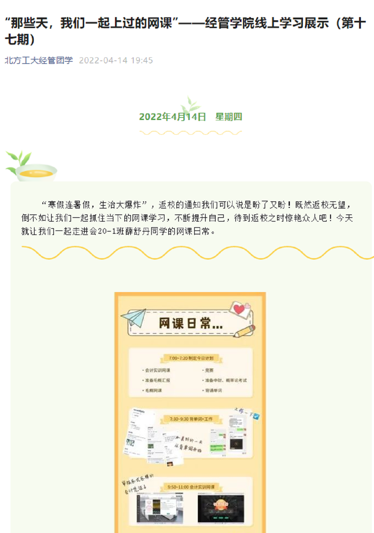 活动一经推出,员工参与热情高涨。同学们通过vlog、图片和文字等形式分享居家学习生活。大家的打卡内容广泛,除了分享上课日常外,还包含考研日常、读书笔记、英语积累、学术科研等内容。通过学习展示,为同学们提供了互相督促、互相激励的交流平台,切实提高了同学们的学习积极性。在“卡路里杯”运动打卡活动中,同学们参与居家运动项目,既有舒展身心的瑜伽,也有充满挑战的“一分钟”项目,提高免疫力,保持身心健康,为抗疫助力。