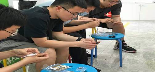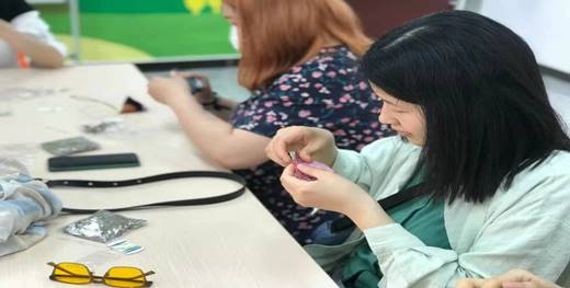 活动中,大家一边缝针,一边讨论如何更好更快地缝制香囊。从最开始的穿针引线,到一针一线将香囊缝合,并学会做双抽线将香囊收紧,有的成员是第一次拿针,针脚虽然歪歪扭扭,却也做得像模像样;有的成员相当心灵手巧,制作了不同形状的香囊。在制作过程中,大家都学得很认真,不一会儿,一块块布、一颗颗小珠子就变成了一个个形状优美、色彩斑斓的香包。