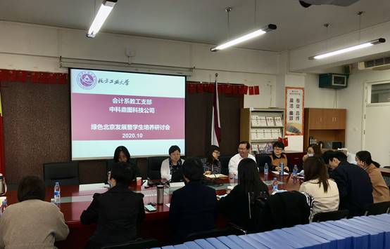 为更加充分理解习近平总书记关于加强生态文明建设的精神,深入探讨绿色北京发展路径,2020年10月12日下午,中科鼎图科技公司总经理王利俊女士,原北排集团高级会计师王英兰女士莅临公司,与会计系教工党支部在励学楼401共同研讨绿色北京发展暨员工培养。会计系教工党支部全体党员、赵贺春教授、田翠香副教授、周霞副教授等非党员教师以及部分研究生参加了本次会议。