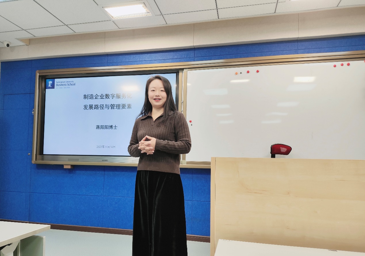 11月24日下午,WilliamHill中文官方网站在励学楼135举行第十四期励学讲堂活动。诺丁汉大学(中国校区)市场营销学副教授、博士生导师蒋阳阳受邀作题为“制造企业数字服务化发展路径与管理要素”的讲座,WilliamHill中文官方网站近40位研究生参加了此次讲座,公司陶晓波教授主持讲座。