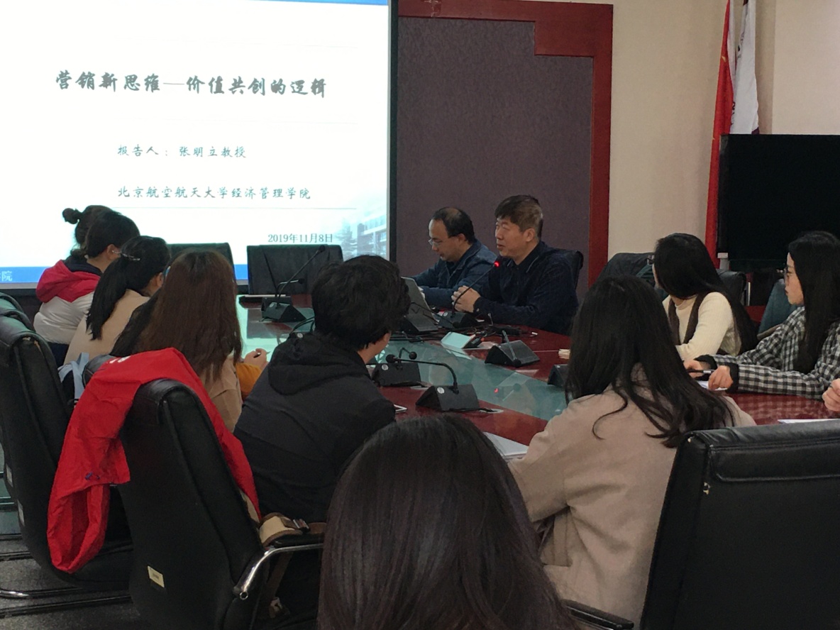 11月8日,北京航空航天大学张明立教授应邀在励学楼201会议室做了题为“营销新思维—价值共创的逻辑”的学术报告。企业管理硕士点的老师和研究生参加了报告会。该报告是工商管理学科“新时代·新管理论坛”之专家讲座之一。