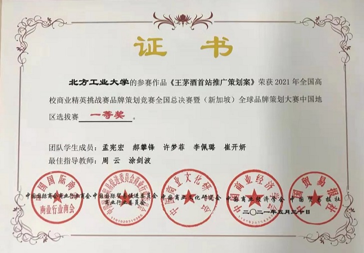 员工荣获2021年全国高校商业精英挑战赛品牌策划 竞赛全国总决赛暨(新加坡)全球品牌策划大赛 中国地区选拔赛一等奖 |