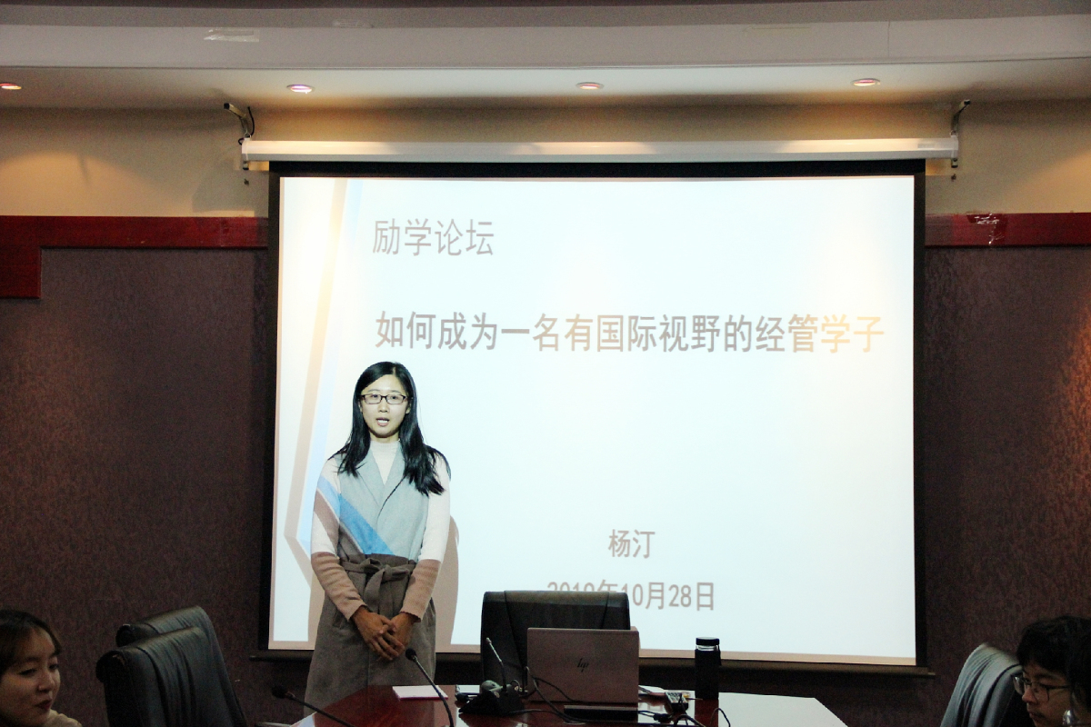10月28日晚,WilliamHill中文官方网站励学论坛在励学楼201会议室举行。本期论坛主题为“如何成为一名有国际视野的经管学子”。本次论坛由教师辅导员杨汀老师主讲,青创部协办,19级国际班有出国深造意向的同学参加了此次论坛。