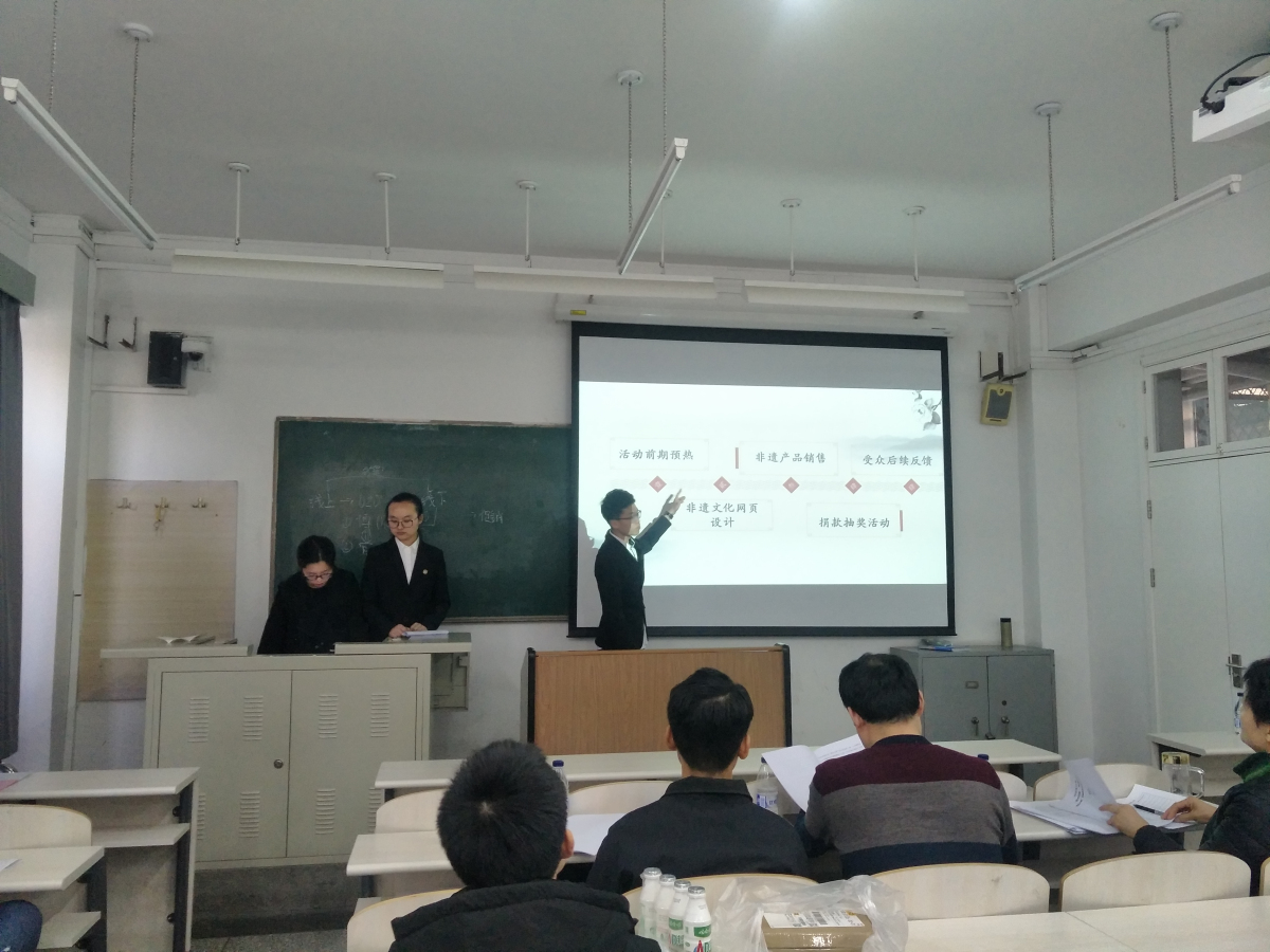 12月17日下午,WilliamHill中文官方网站在励学楼225教室举行了非物质文化遗产传承创意营销大赛复赛答辩。经过初赛的筛选,本次复赛答辩共11组同学参加,此次复赛包括自述和评委提问两个环节。