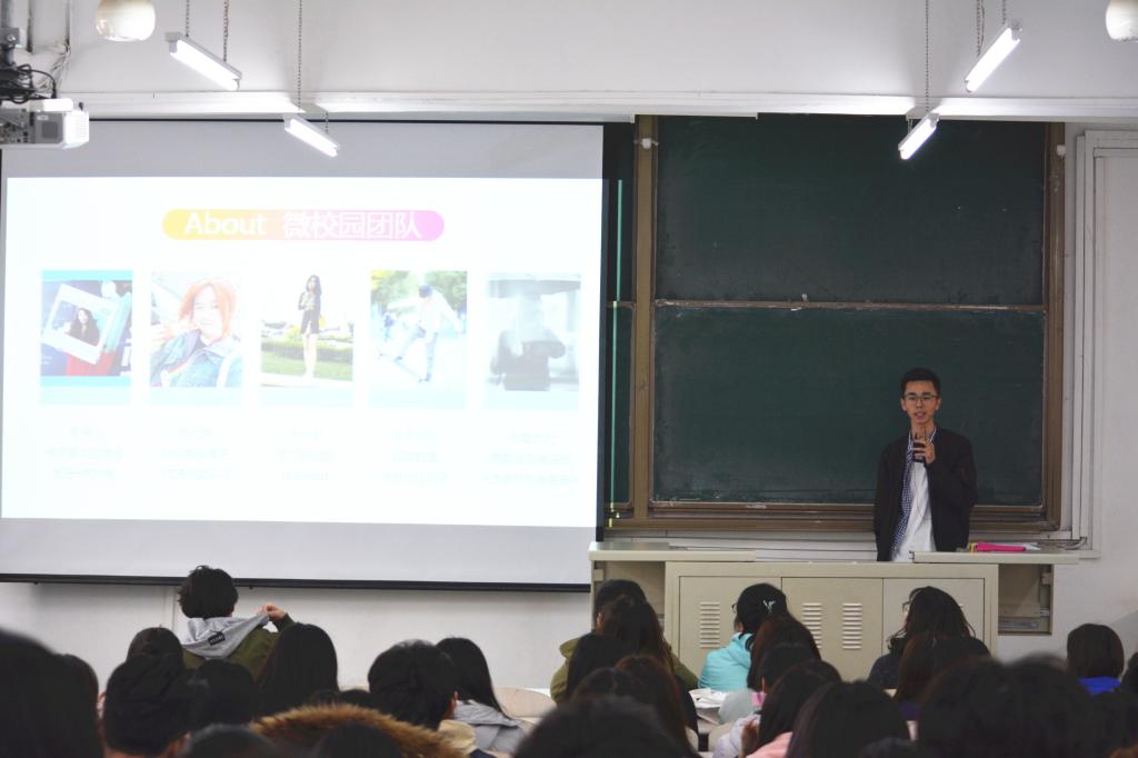 马可同学从自身管理运营微校园团队和校员工会宣传的经历说起,建议大家在工作中关注伙伴的成长,要身先士卒,同时要注重工作的仪式感,形成团队精神和团队文化。此外,他还向大家介绍了新媒体运营中标题的写法,展示了各式各样的朋友圈,生动地说明了标题的作用。