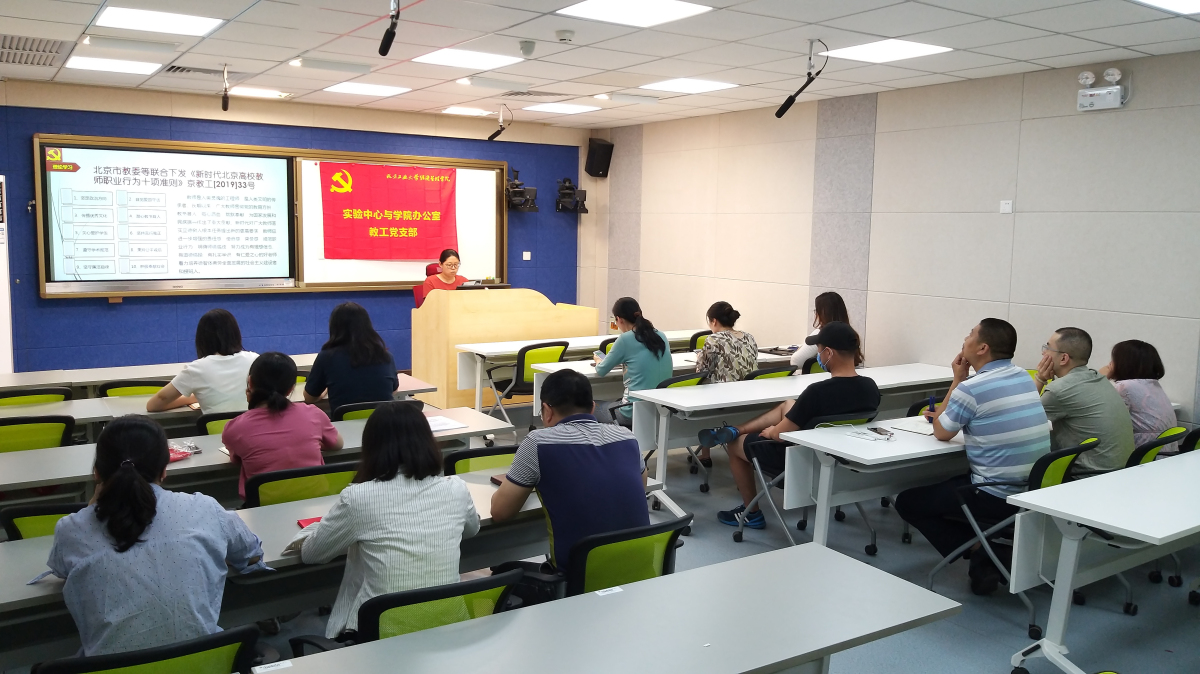 为深入贯彻执行市委教工委、市教委、市人力社保局印发的师德建设相关文件精神,WilliamHill中文官方网站实验中心与办公室教工党支部于6月13日下午在励学楼135开展师德建设集中理论学习活动。此次学习活动由中办党支部书记牛天勇同志主持,WilliamHill中文官方网站实验中心、行政办公室、党务办公室和员工工作办公室的16名教职工参加了本次学习活动。