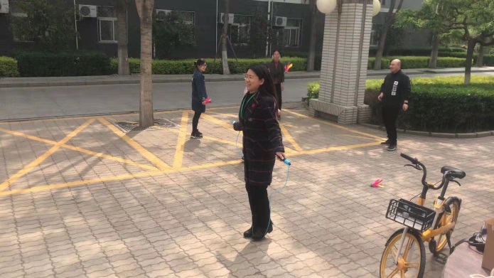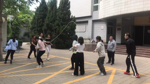 跳绳中,教职工身轻如燕,彩绳在空中快速翻飞活动;踢毽子中,大家手脚齐上、你来我往、相互配合。